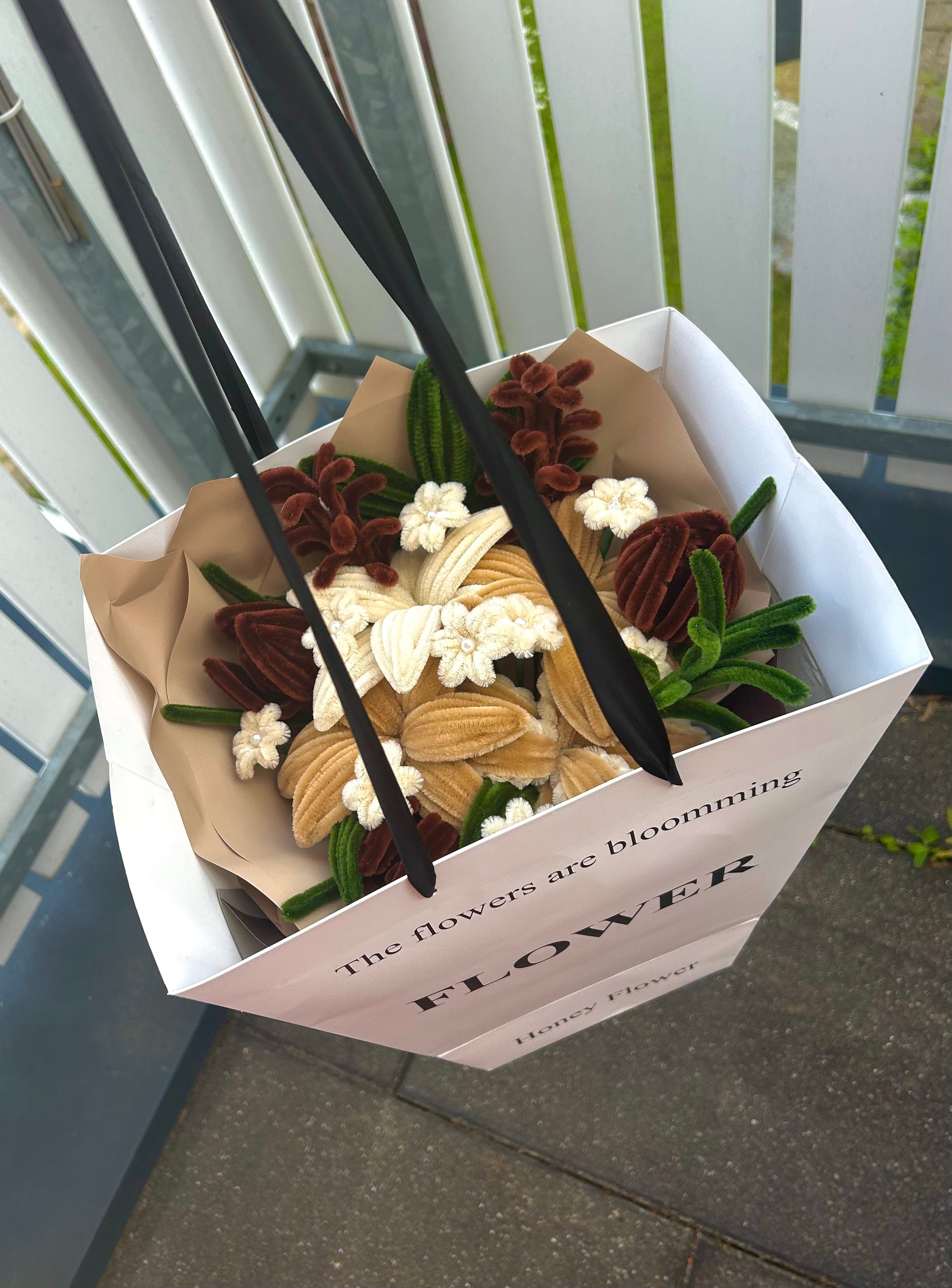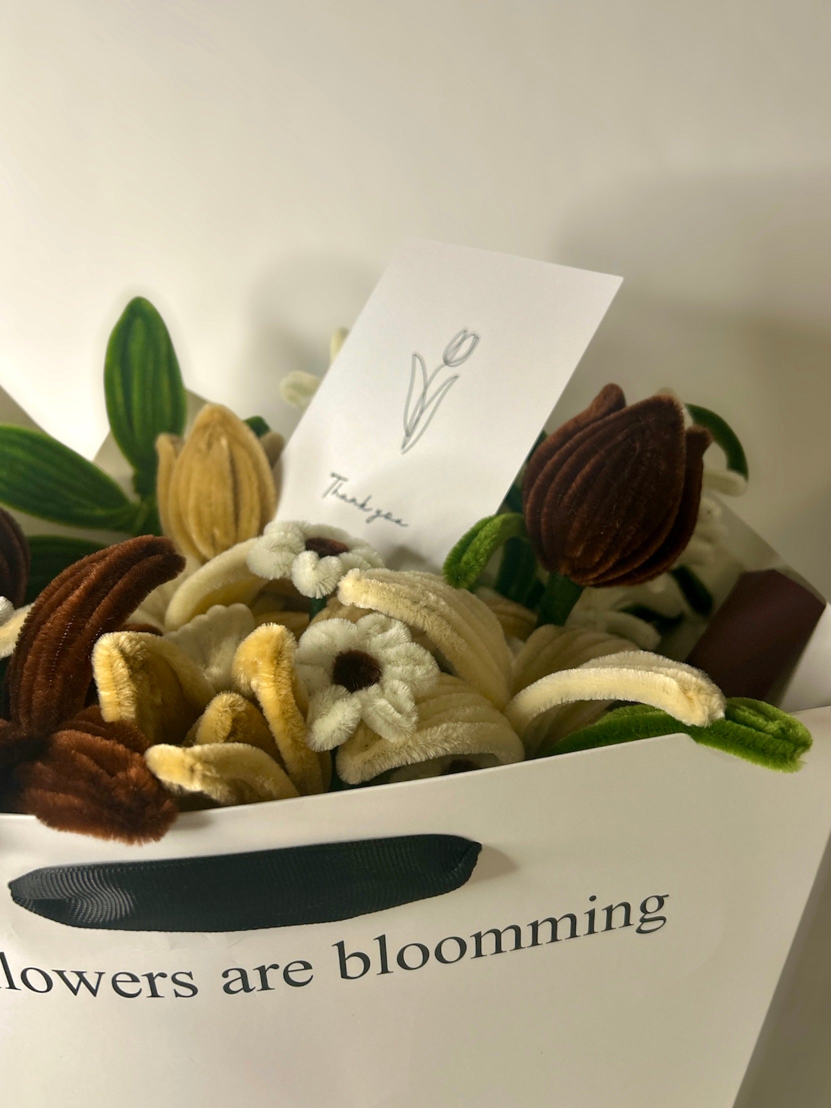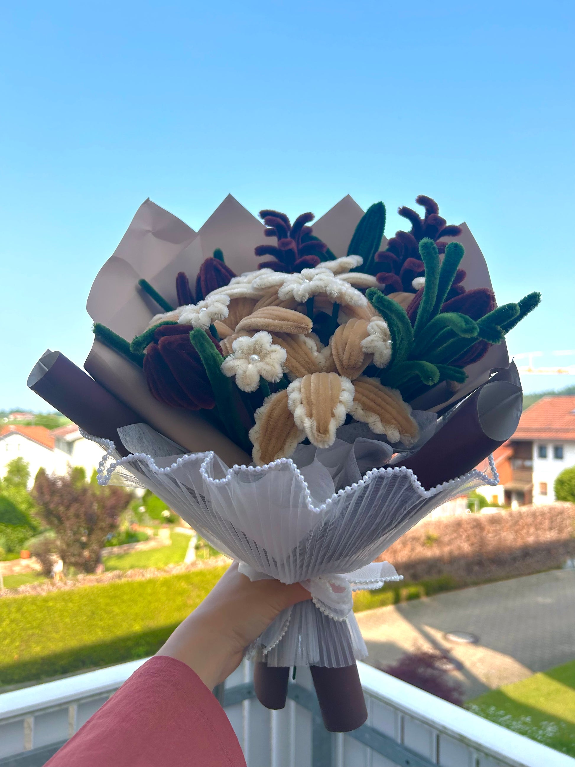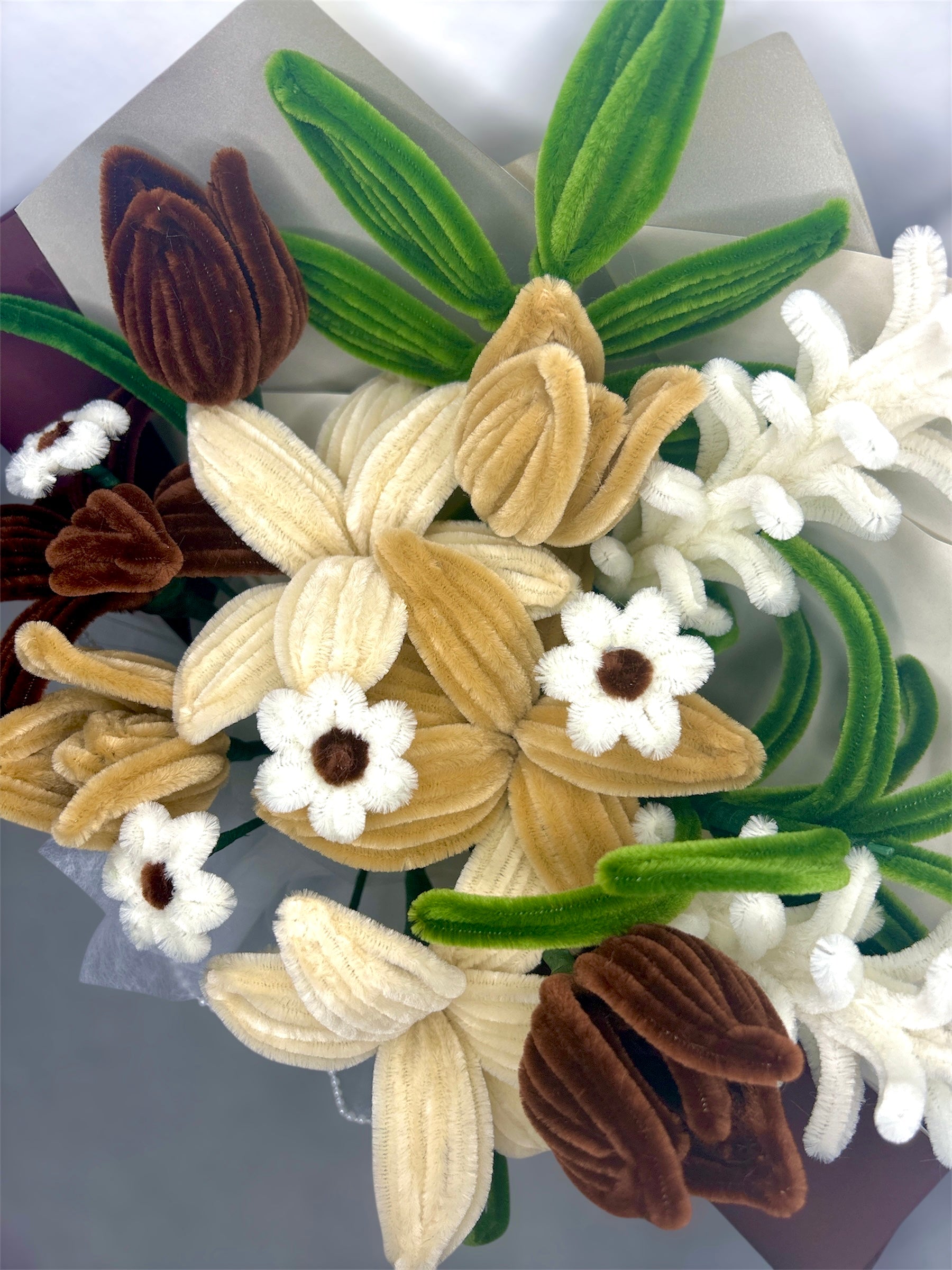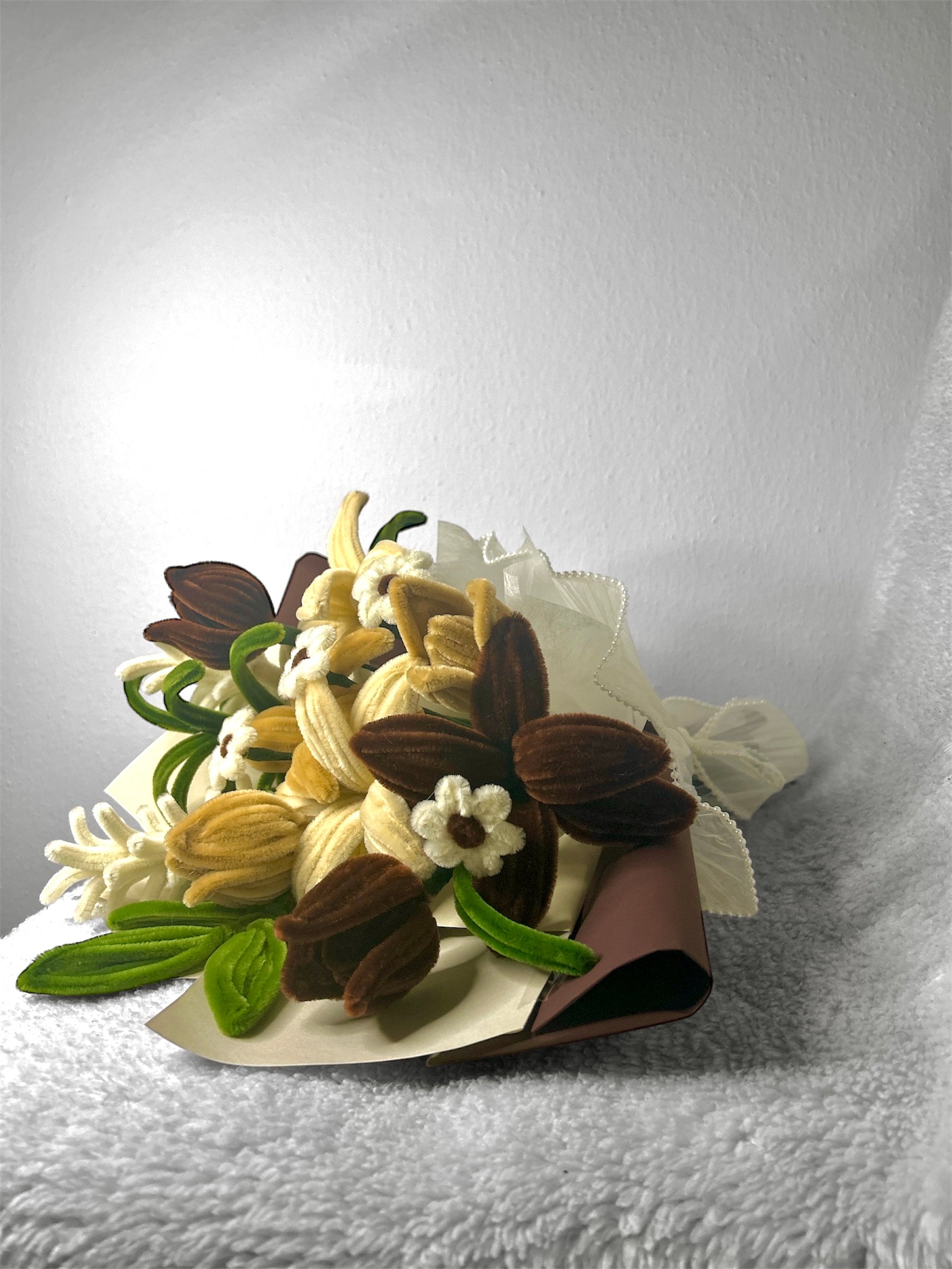 Dies ist ein handgefertigtes Blumenstrauß aus Pipe Cleanern mit dem Namen "Brown Poetry".