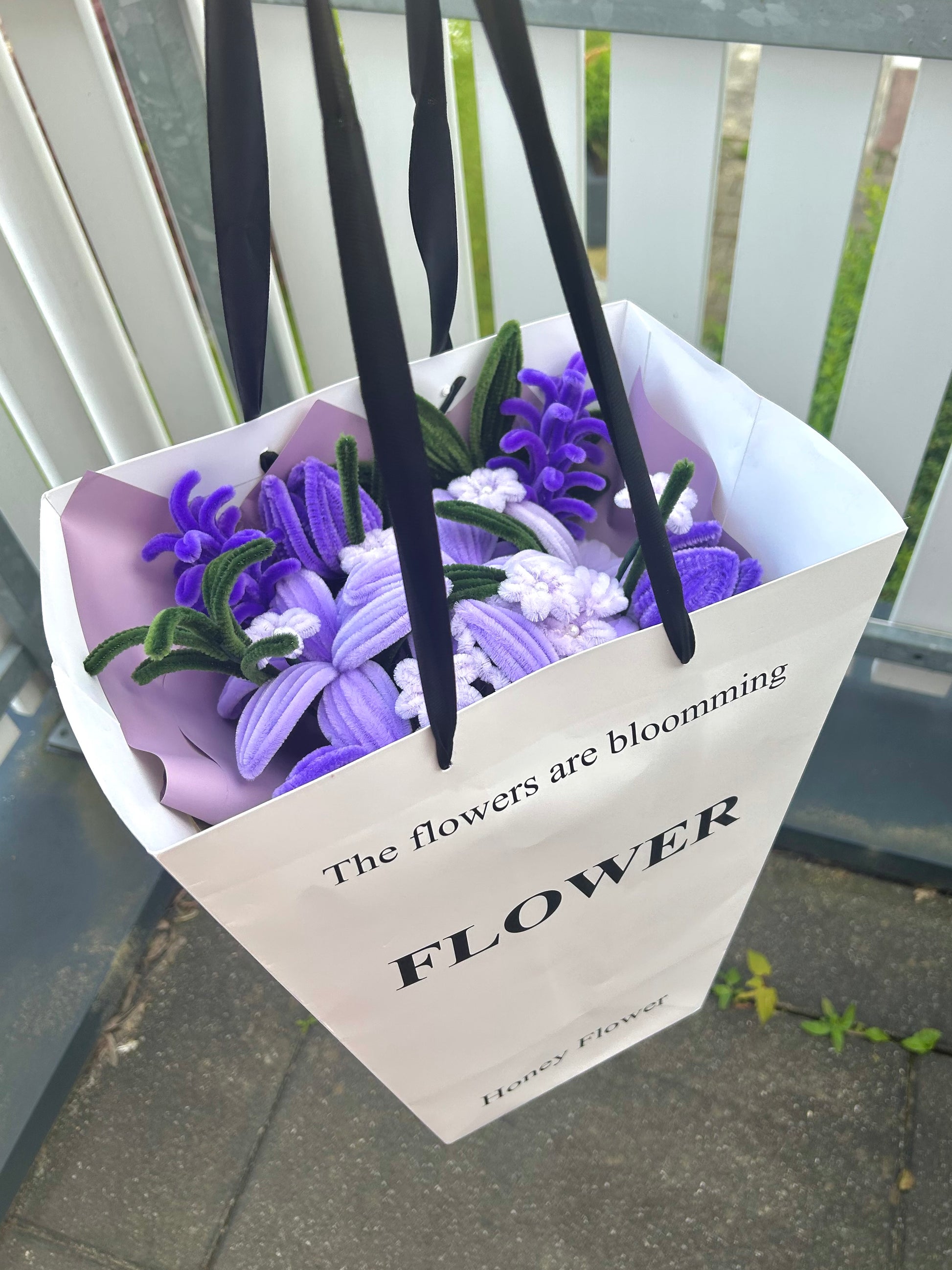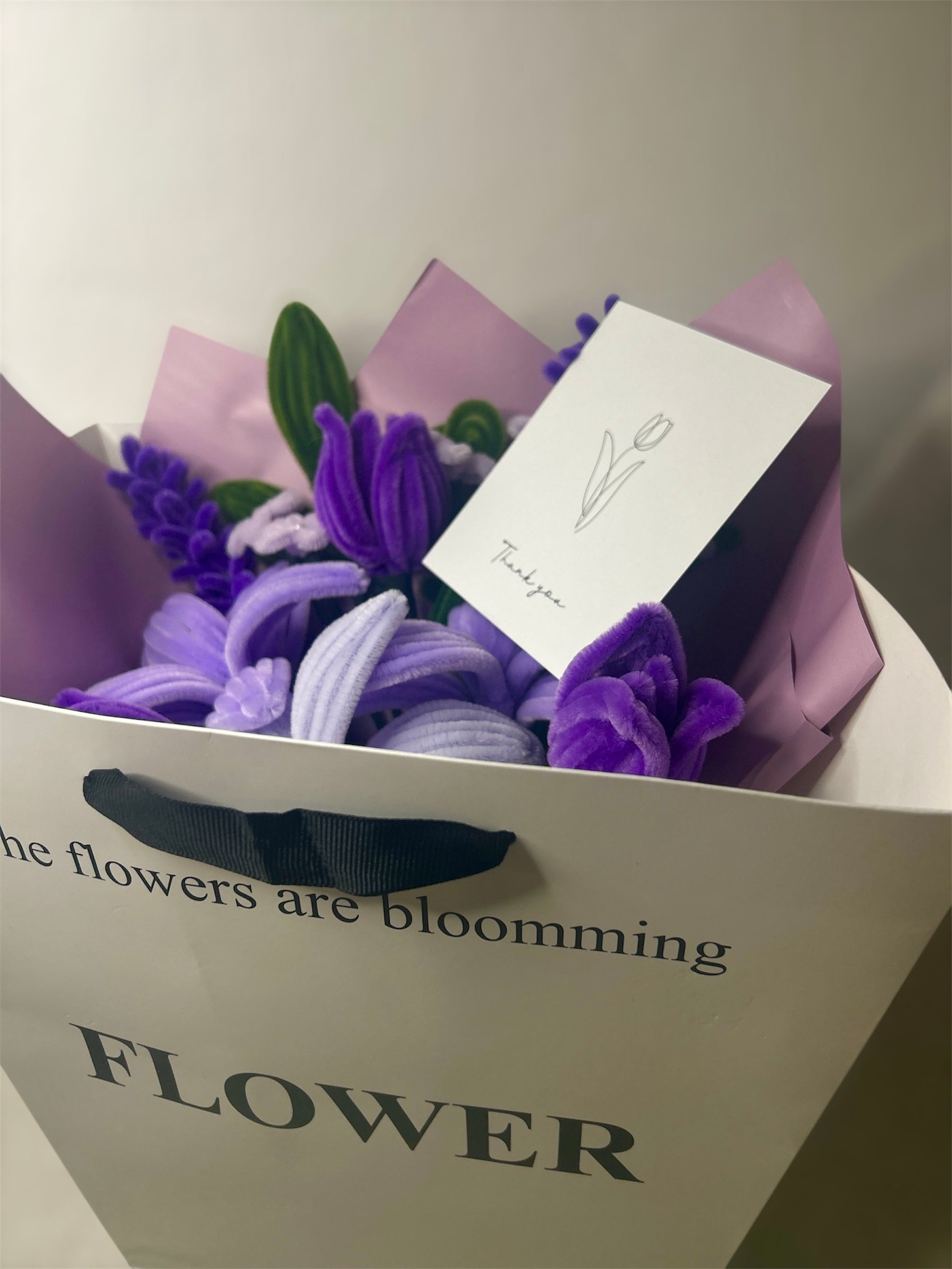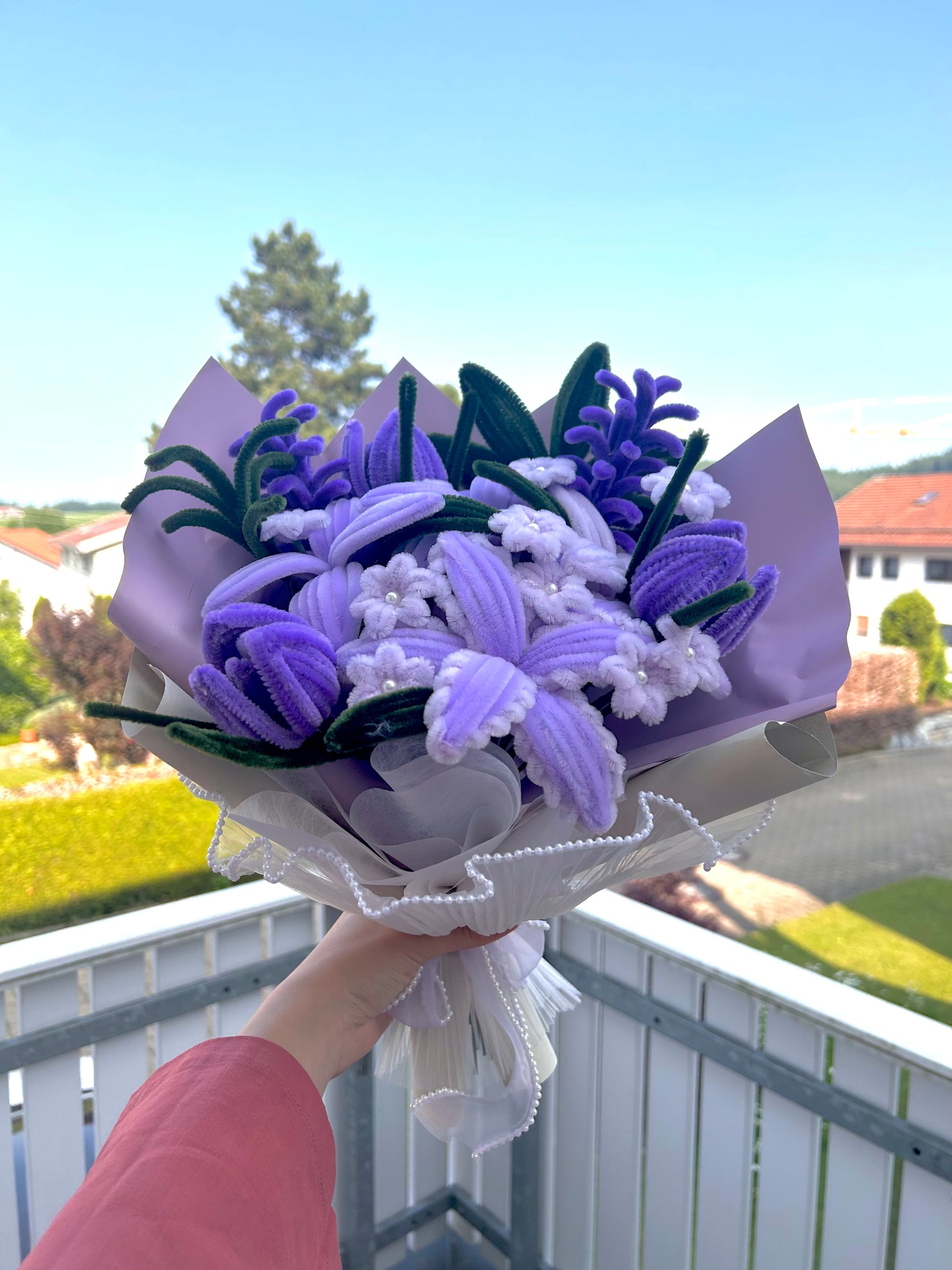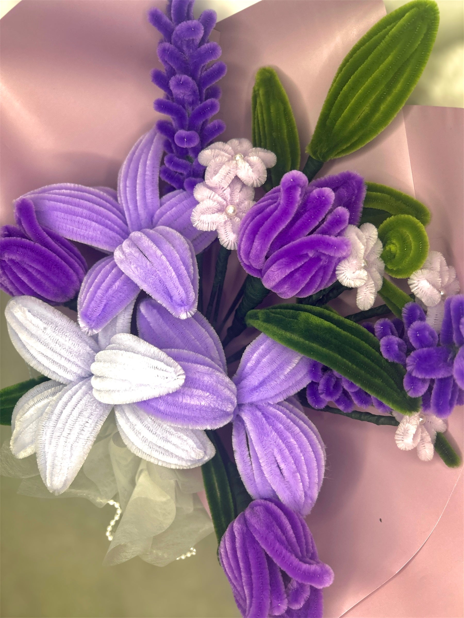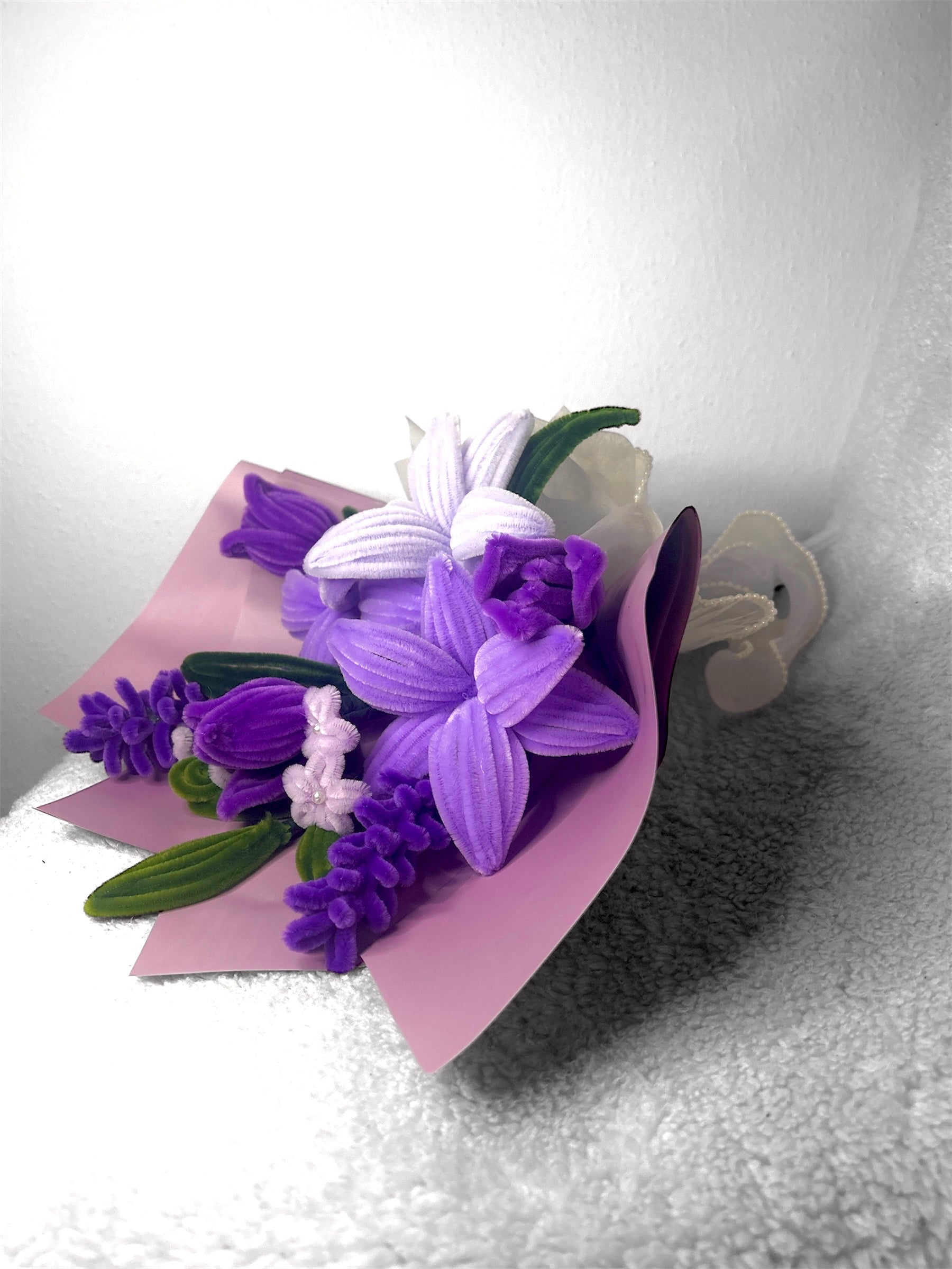 Dies ist ein handgefertigtes Blumenstrauß aus Pipe Cleanern mit dem Namen "Purple Dream".