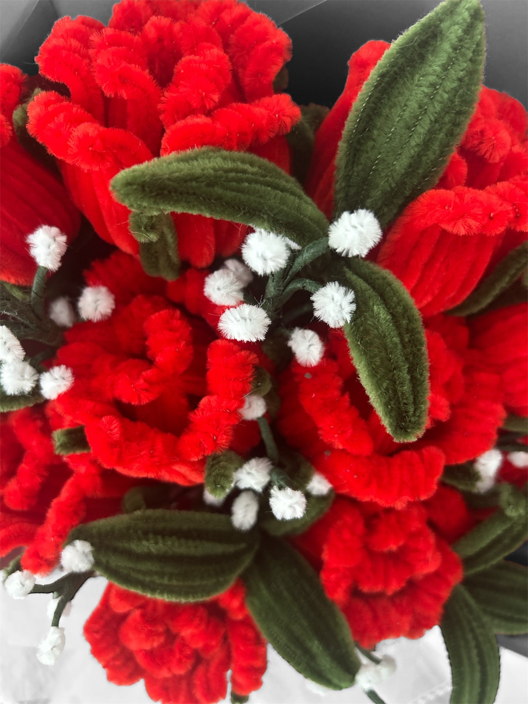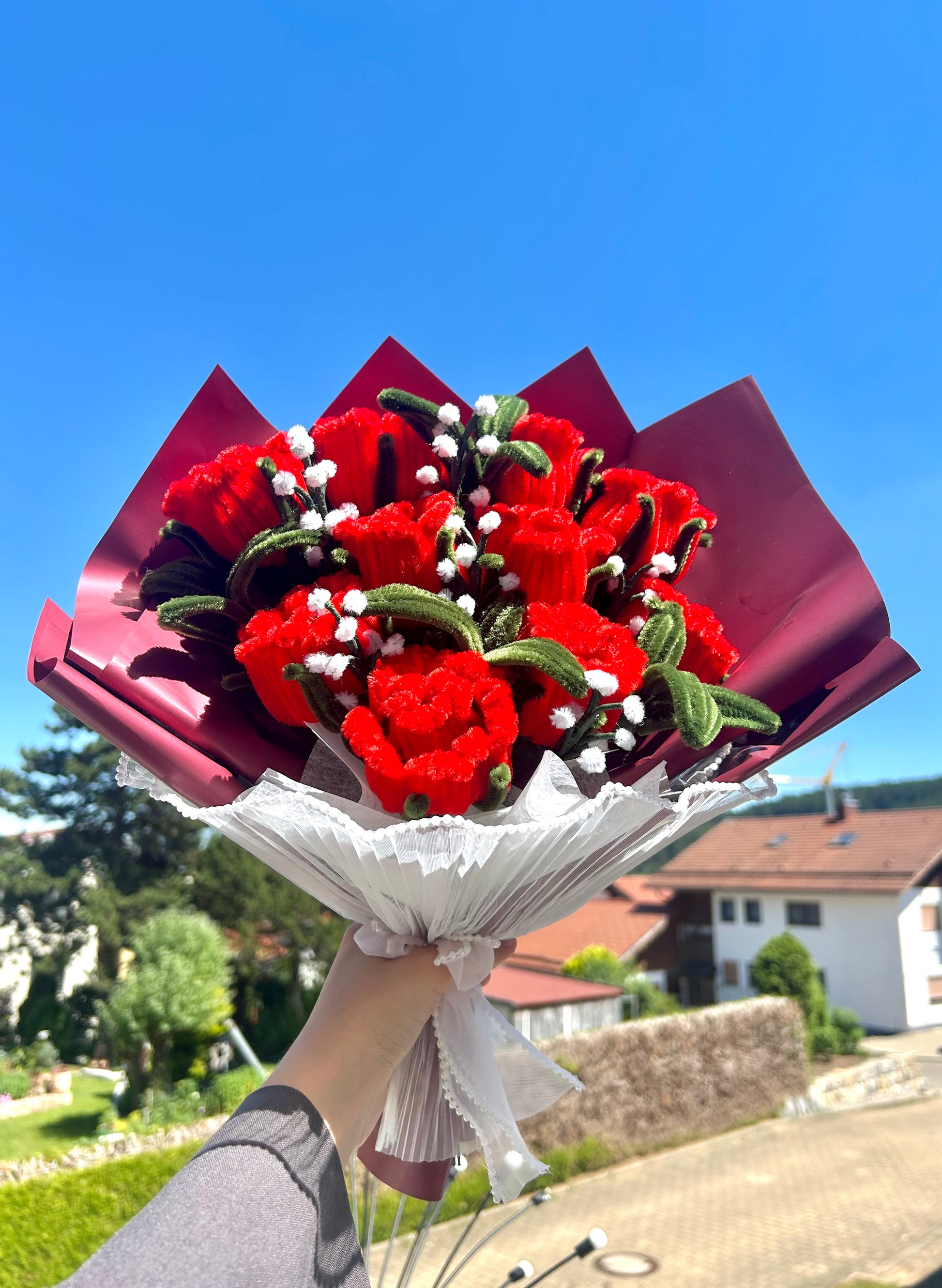 Dies ist ein handgefertigtes Blumenstrauß aus Pipe Cleanern mit dem Titel "Red Bloom".