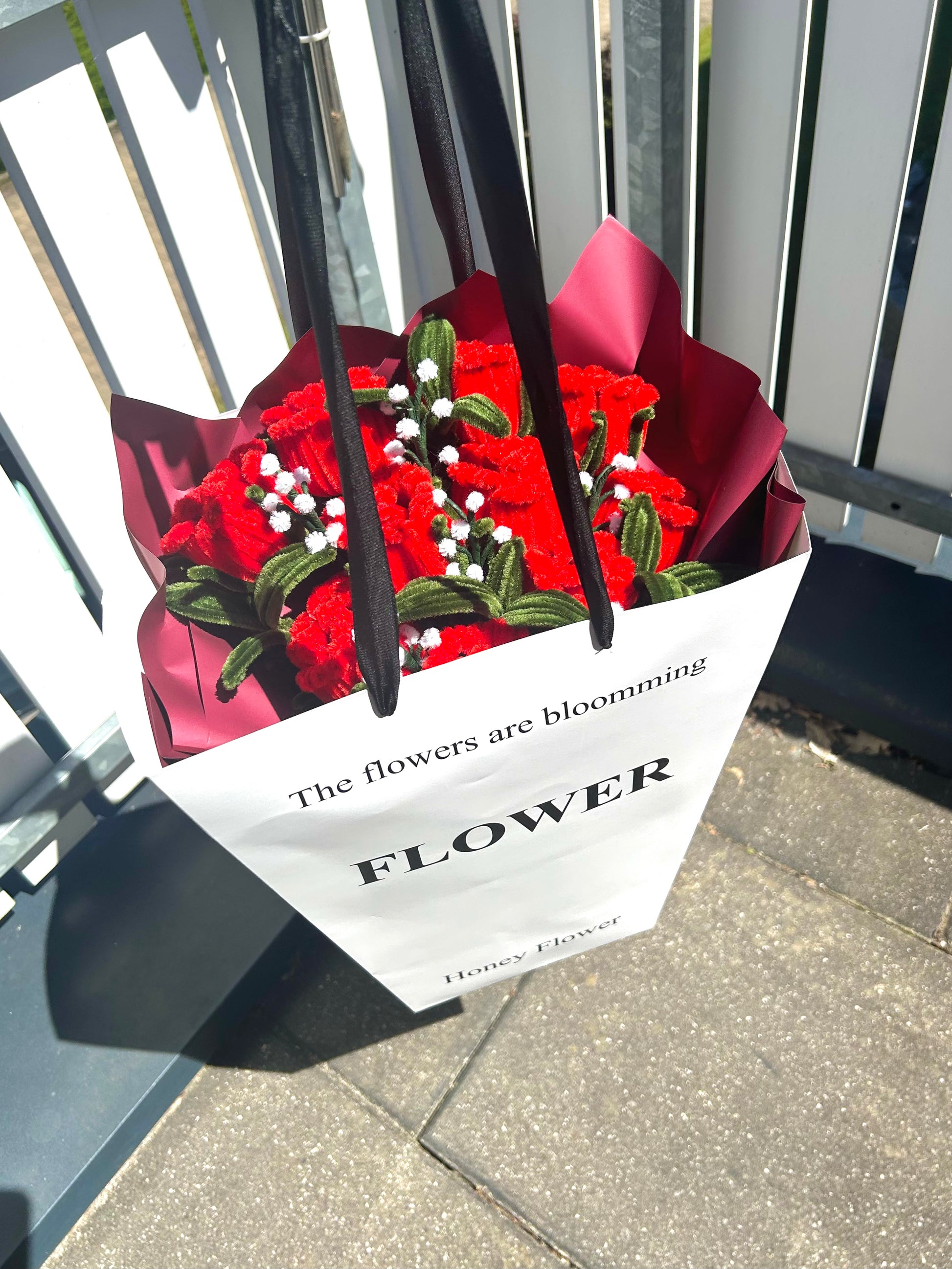 Es wird wie abgebildet, mit Blumenverpackung und -tüte versendet.
